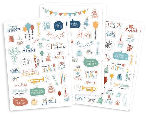 Fröhliches Sticker-Set zum Geburtstag. Einfach schön für persönliche Geschenke und Geburtstagskarten oder kreative Kalender- und Notizbucheinträge. Das Set enthält über 200 farbig illustrierte Sticker, verteilt auf insgesamt 6 Bögen im Format A5 (3 verschiedene Sorten je 2 Bögen).